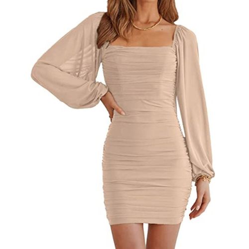 Wenrine Women's Mesh Long Sleeve Square Neck Ruched Party Club Cocktail Bodycon Mini Dress