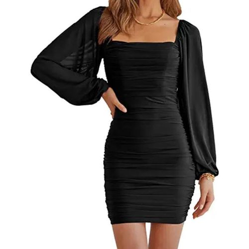 Home > Women's Mesh Long Sleeve Square Neck Ruched Party Club Cocktail Bodycon Mini Dress