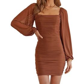 Women's Mesh Long Sleeve Square Neck Ruched Party Club Cocktail Bodycon Mini Dress (Color: Coffee, size: M)